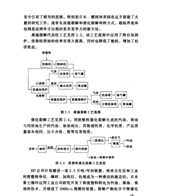 裂化,lkg废塑料产油最多可达iL。这种技术不使用搅拌装置,只适合于聚烯烃,还不能用于含卤类塑料。