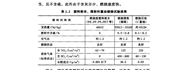 塑料燃烧可释放大量的热量,聚乙烯和聚苯乙烯的热值高达46000kJ/kg,超过燃料油平均44000kJ/kg的热值。燃烧试验表明,废塑料完全具备作为燃料的基本性质。它与煤粉、重油的燃烧对比试验详见表2.2。从表2.2中可看出,废塑料发热量与煤和石油相