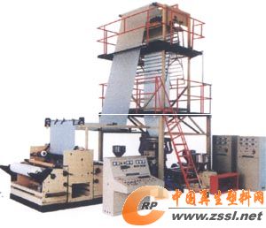 该机组由三台挤出机配合一套辅机组成,机头和冷却风环可连续旋转,可将LDPE、LLDPE、
