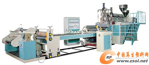 二、性能特点 1、挤出机螺杆采用是大长径比,具有塑化效果好、片材厚薄均匀、流速一致等优点。 2、该机组采用先进电动快速换网装置或不停机液压快速换网装置,操作方便,性能优越,提高了生产效率。 3、高精度分配器,衣架式模头,保证出模流体截面的流速及压力均匀。 4、压延辊采用油缸调节,操作方便,精度高。 5、超镜面压光辊,辊筒表层温度均匀,使生产的片材光洁明亮,厚薄均匀。 6、本机可根据制品的不同用途选用不同特性的塑料生产多种颜色的复合片材。