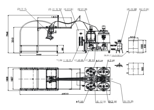 本设备由浇注系统、加热系统、温度压力数据采集监控系统、人机界面操作系统、浇注头微电脑控制系统、计量泵转速变频闭环控制系统、注料、清洗系统、料液储罐循环系统、真空系统、制冷冷却系统、远程监控系统等组成。