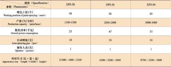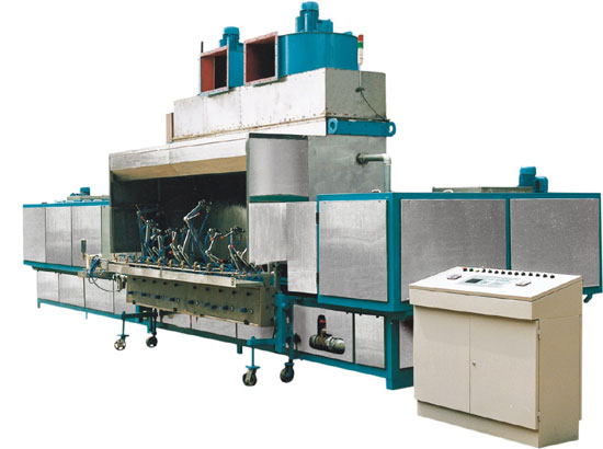 由加热器、风机等构成的烘道系统,其烘道温度可自动控制。喷色件经喷色并通过烘道干燥后,最后能自动从喷色支架上卸下;