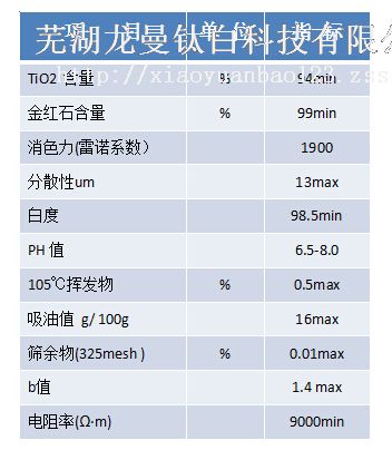 基本参数: 化学名称 二氧化钛 (TiO2) CAS编号 13463-67-7 EINECS编号 236-675-5 产品状态 白色粉末 表面处理 致密锆、铝无机包膜 + 特殊有机处理 二氧化钛含量 % ≥94.0 金红石含量% ≥99.0 105oC挥发物% ≤0.5 分散性 um ≤13 筛余物(325目) ?% ≤0.01 水悬浮液PH值 6.5-8.0 吸油量 ?g/100g ≤16 消色力(雷诺值) ≥1900